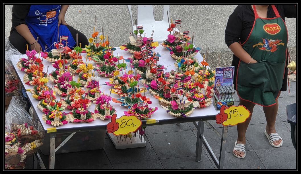 Von hier liefen wir noch zum Terminal 21 Shopping Center. Unterwegs konnten wir schon die Verkaufsstände für die Krathongs sehen, die für den Abend verkauft werden.