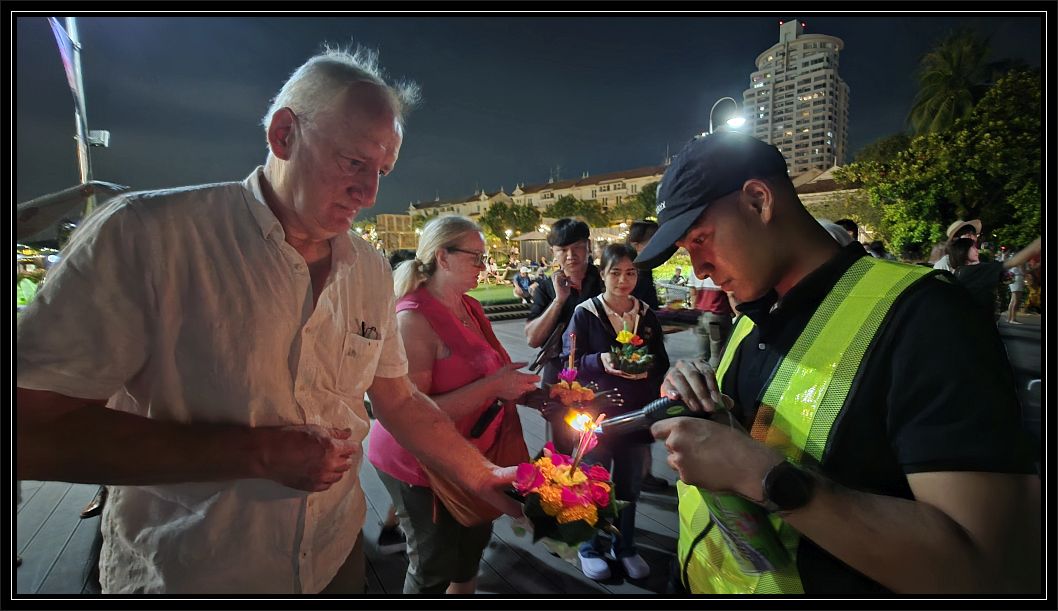 Sicherheitshalber kauften wir uns noch vor dem Gelände ein Krathong (Palmenblattboot), das wir später auf dem Fluss schwimmen lassen wollten. Wenn wir schon hier sind, dann müssen wir auch mitmachen.