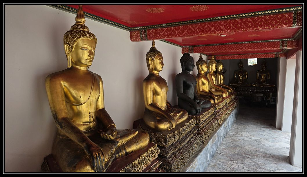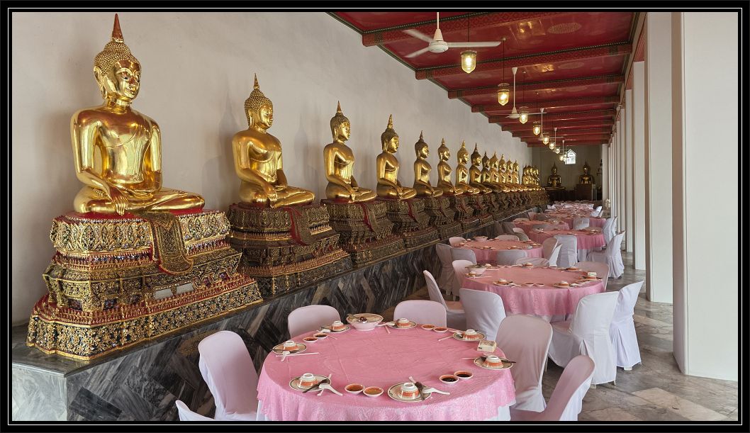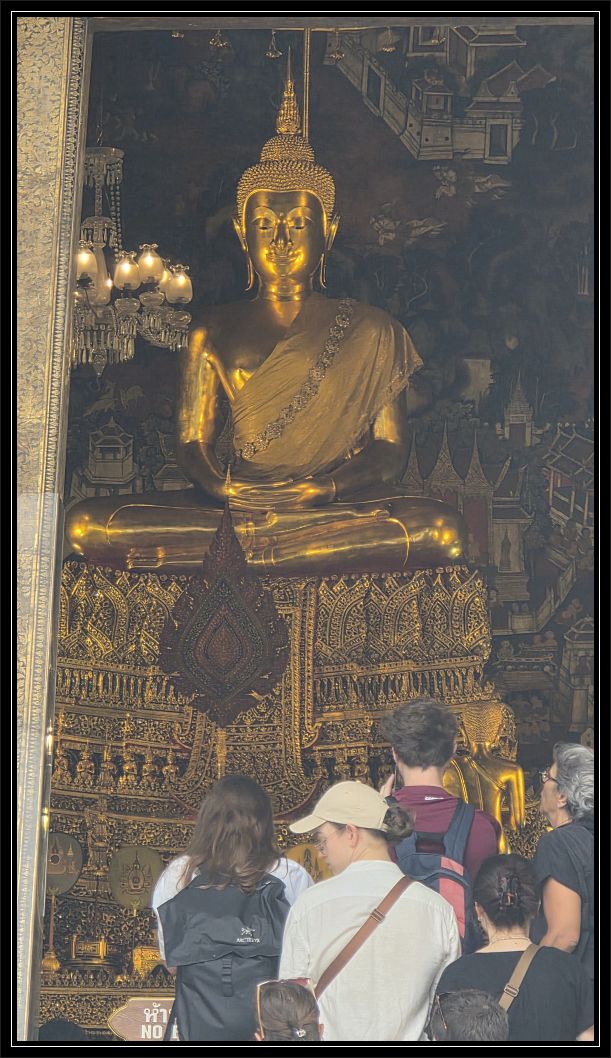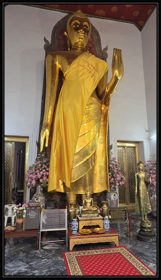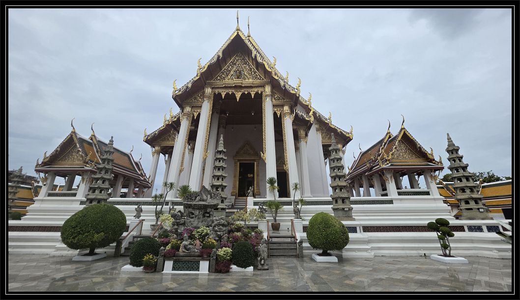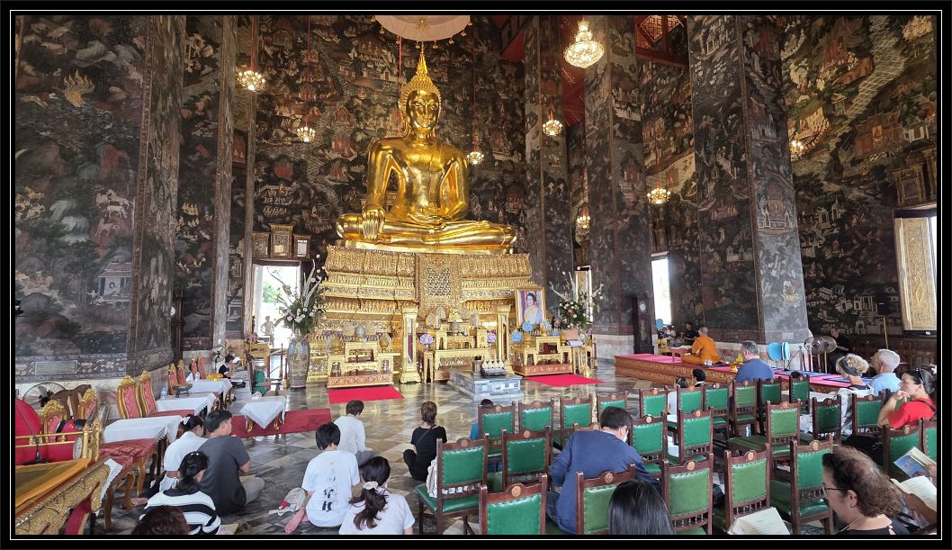 In den Großen Palast konnten wir leider nicht rein, denn wegen des Todes der früheren Königin Sirkit ist der Palast für 2 Wochen geschlossen. Also sind wir zum nächsten Tempel, dem Wat Suthat gegangen. |