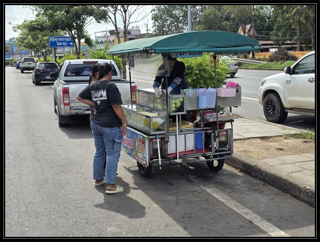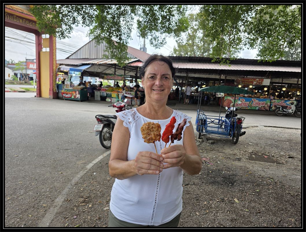 Sogar die ersten drei Fleischspieße vom Marktstand gönnten wir uns. Kostenfaktor: ~ 80 Cent für alle drei zusammen. Erfolgreicher Test bei 66%, denn der dritte Spieß war Leber, die Ramona eh nicht isst und ich hier besser auch verweigerte. |