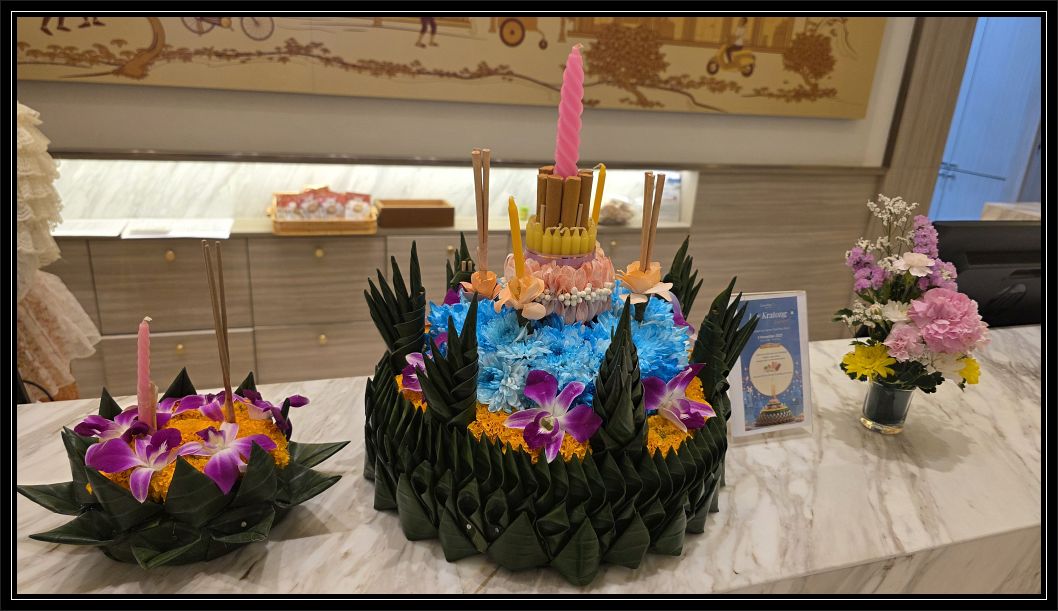 Gegen halb Neun verließen wir das Hotel und machten uns auf den Weg zur Bahn. An der Rezeption fragte ich sicherheitshalber nach, ob heute wirlich das Lichterfest (Loy Krathong) gefeiert wird. Die junge Dame lächelte und zeigte neben sich, denn da waren zwei Krathongs als Deko aufgestellt. Also alles schick für den heutigen Abend.