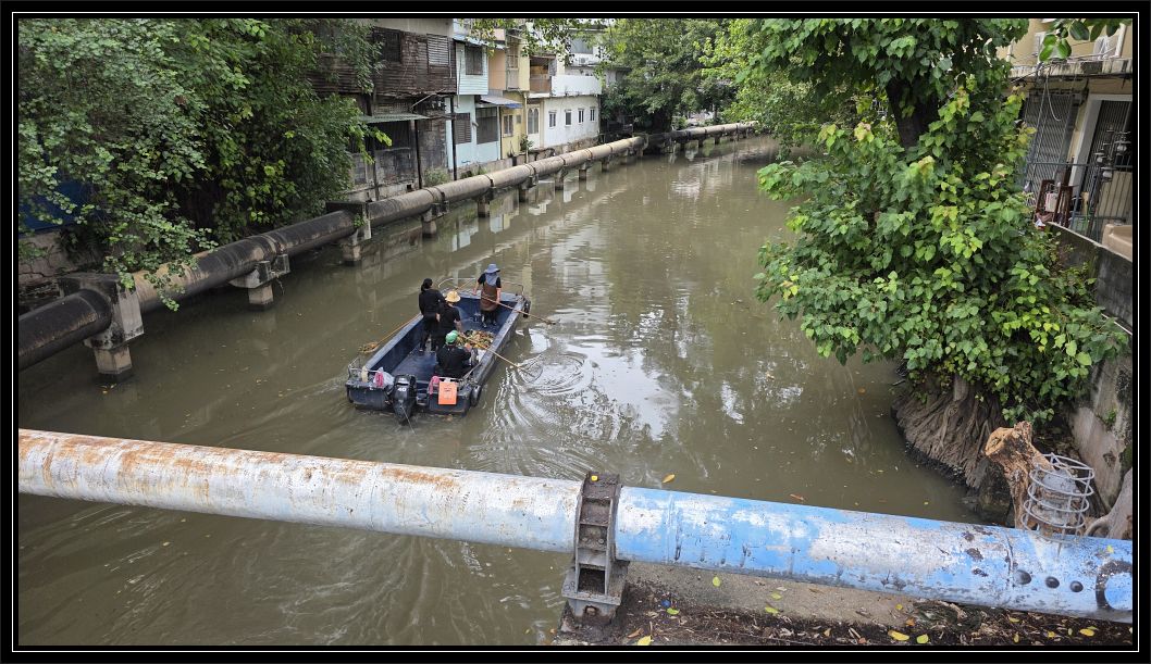 Den heutigen Tag konnten wir entspannt angehen, da wir erst mal keine terminlichen Verpflichtungen hatten. Ganz gemütlich um 6:30 Uhr aufgestanden, gefrühstückt und für den Tag fertig gemacht. Kurz nach Acht sind wir los in Richtung Tempelbereich, denn der Wat Pho war unser Ziel. Anfangs sind wir noch gelaufen und konnten dabei ein Boot beobachten, mit dem der Müll aus einem Kanal gefischt wurde. Wobei es bei der sichtbaren Verschmutzung des wassers nicht wirklcih viel Sinn macht. |