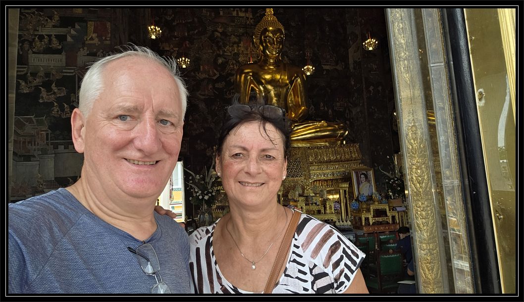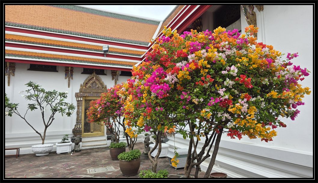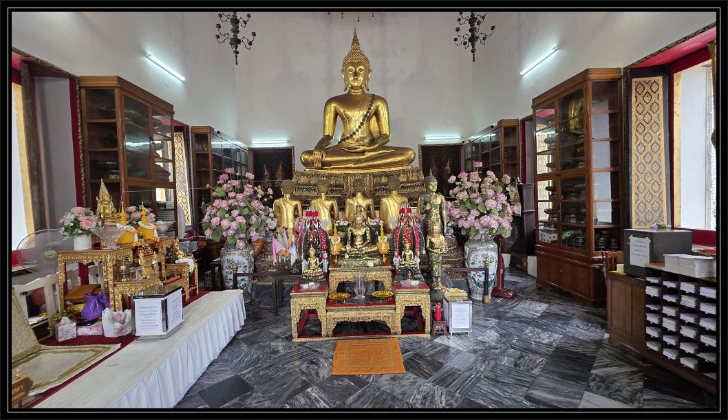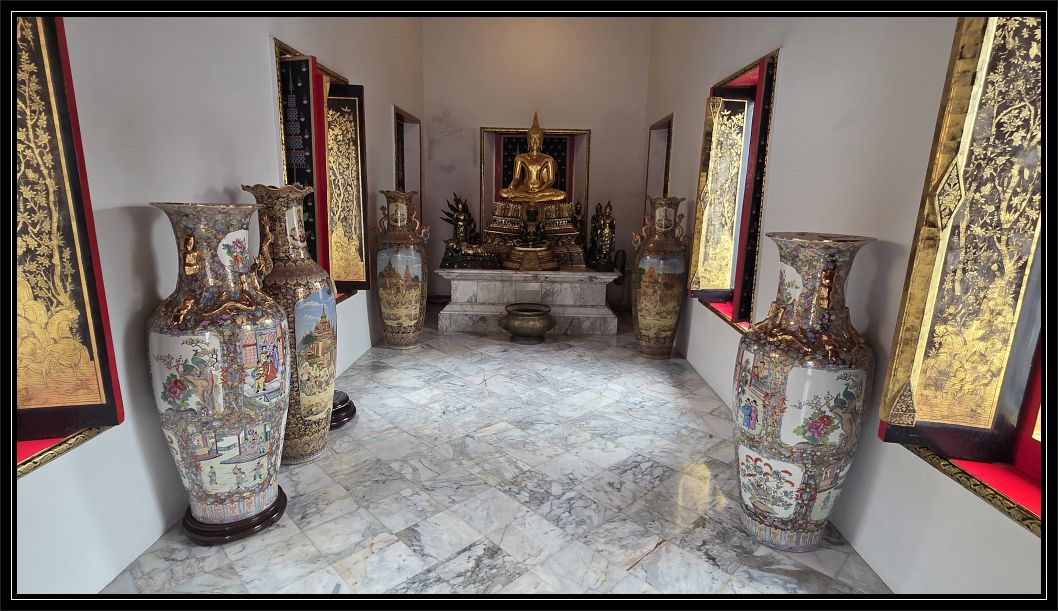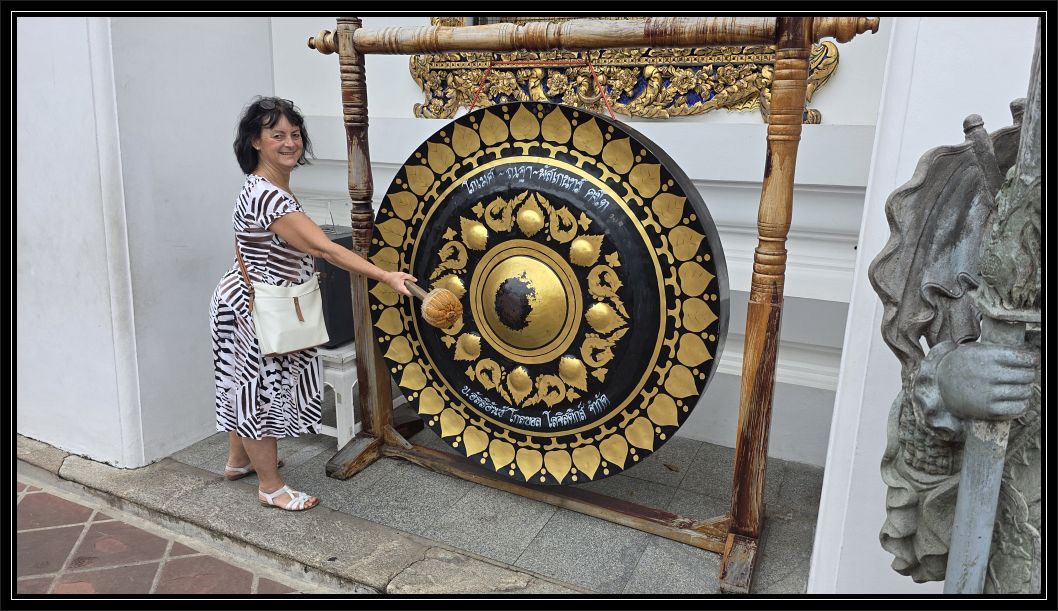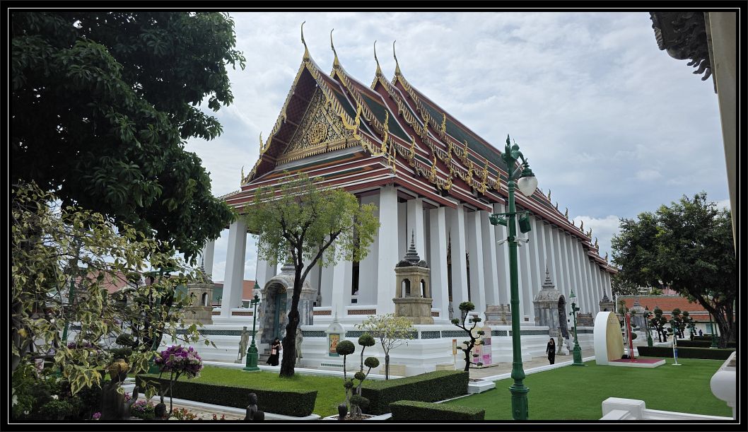 In den Großen Palast konnten wir leider nicht rein, denn wegen des Todes der früheren Königin Sirkit ist der Palast für 2 Wochen geschlossen. Also sind wir zum nächsten Tempel, dem Wat Suthat gegangen. |