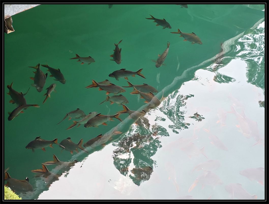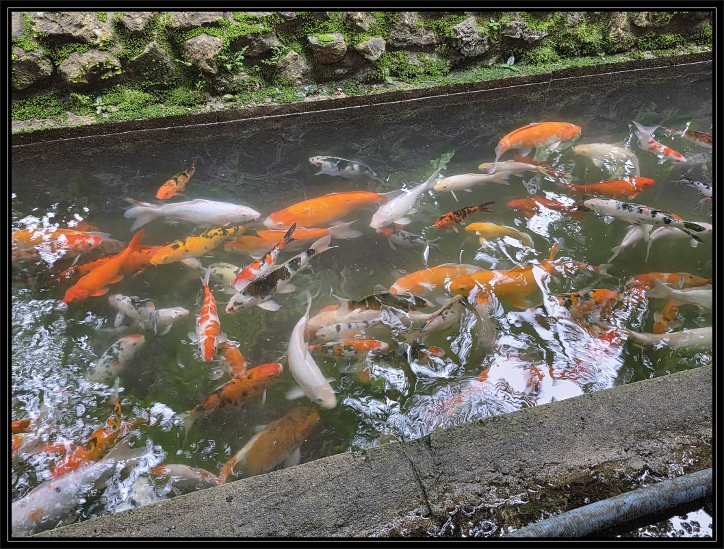 Nach einer etwas gestörten Nachtruhe sind wir kurz nach 7:30 Uhr zum Frühstück gegangen. Ursache der Störung waren die Affen hier im Nationalpark, die wir zwar bisher nicht gesehen, aber dafür um so deutlicher gehört haben. Als wir nachts im besten Schlummermodus waren, fiel es der Bande ein, doch mal remmi demmi auf unserem Dach, also besser dem Dach unserer Hütte, zu machen. Zum Glück dauerte diese Einlage nicht zu lange und wir konnten dann irgendwann wieder weiter schlafen. Beim Frühstück hatten wir direkt neben uns ein Rudel braver Kois, denn sie waren total ruhig. Beim essen mussten wir uns regelrecht zusammenreißen, dass wir nicht den Toast zu den Fischen werfen. |