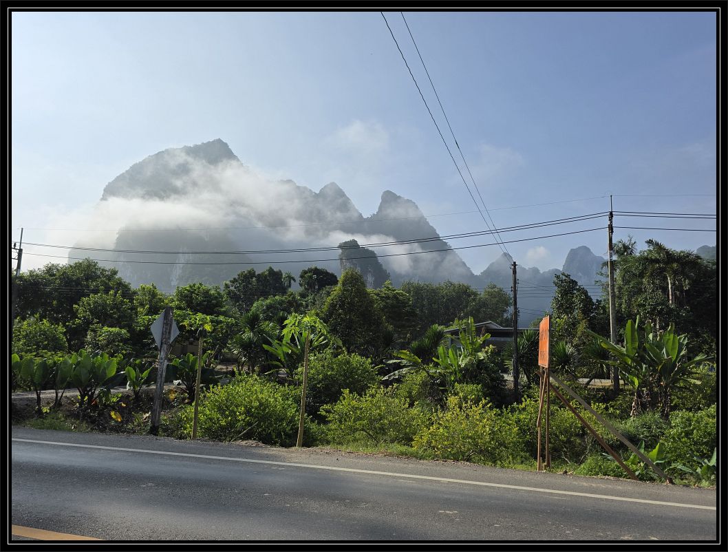 Nach Acht sind wir auf die Piste zum Ratchaprapha Stausee. Anfangs lag noch dichter Dunst auf der Landschaft, aber mit jeder Minute wurde das Wetter und die Sicht besser. |