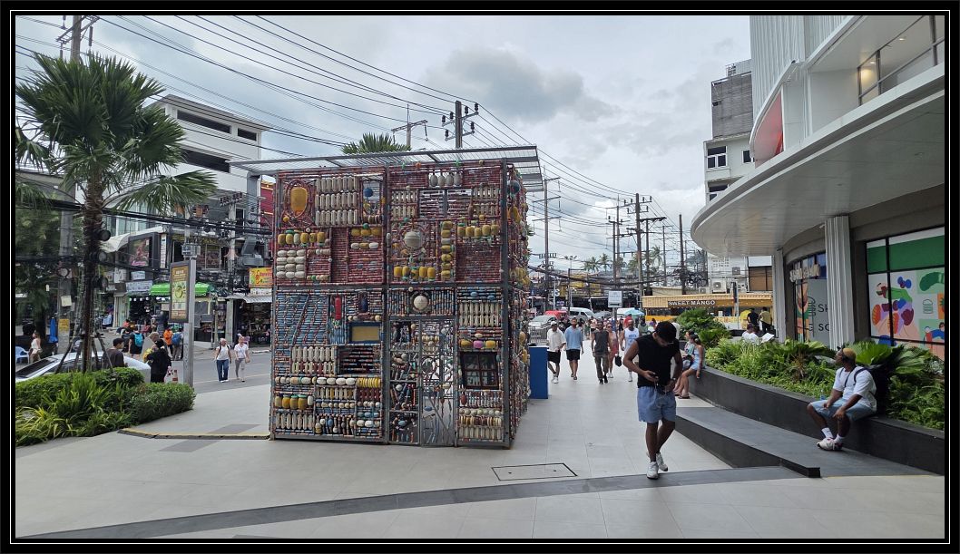 besteht. Und vor dem Center war ein Würfel aus alten Bojen und Korkleinen
