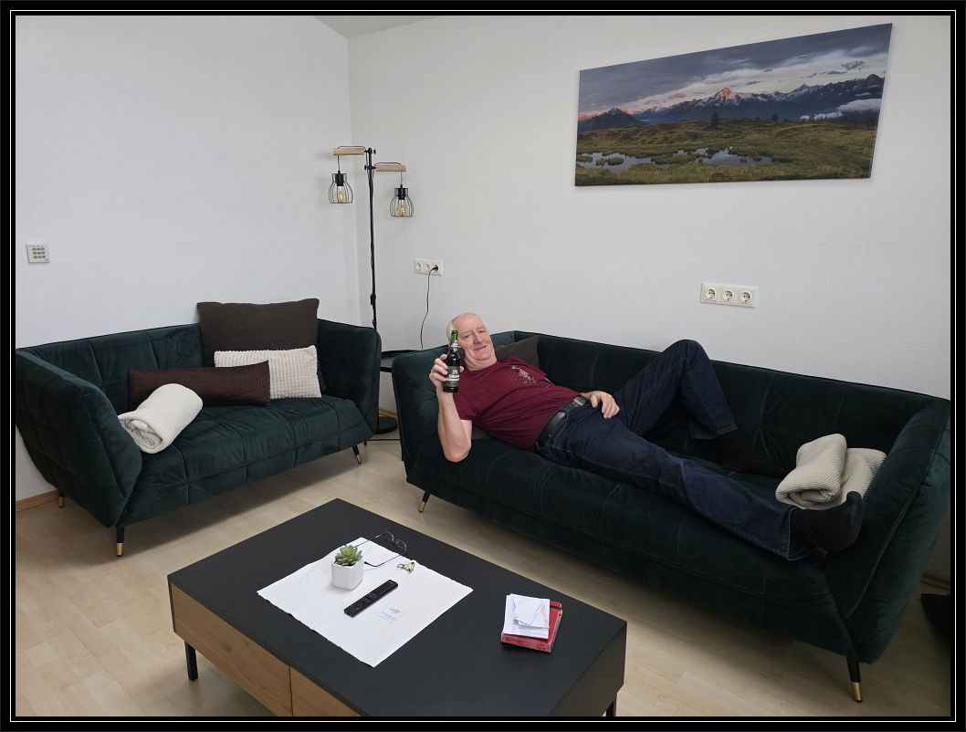Nun kam bei mir aber die Erschöpfung doch durch, und ich okkupierte die Couch. Noch ein Schlückchen Schwarzbier und schon waren die Glubschen zu.